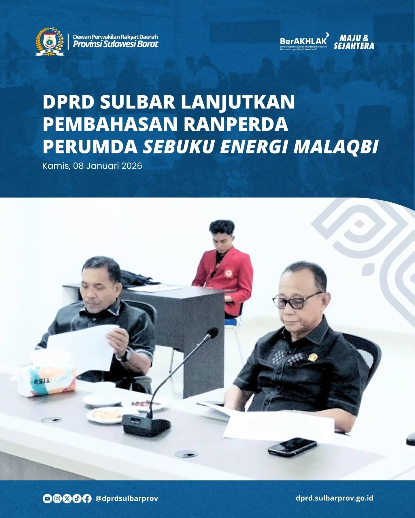 MamujuDewan Perwakilan Rakyat Daerah Provinsi Sulawesi Barat (DPRD Sulbar) menggelar rapat lanjutan pembahasan Rancangan Peraturan Daerah (Ranperda) tentang Perubahan atas Peraturan Daerah Nomor 1 Tahun 2018 mengenai Perusahaan Umum Daerah (Perumda) Sebuku Energi Malaqbi, Kamis (8/1/2026).